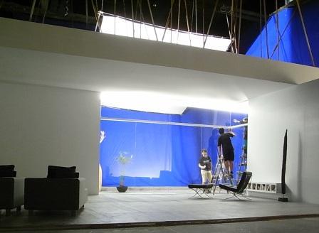 搭出來的景,這跟到時候電視上看到的會不太一樣喔,後面那塊藍色的景會變成海洋。