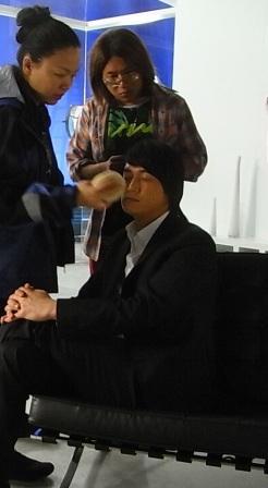 當天清晨六點,我們接了藝人之後,就驅車一路前往龜山鄉的片廠,大部分的工作人員都是五點以前就得起床了。一到了片廠,第一件事情當然就是梳化妝囉。