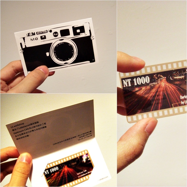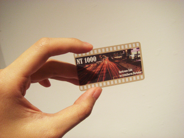 這是開幕當天送給來賓的 Gift Card,紀念Darkroom Cafe開幕的產品。外表看起來是一張折疊的名片,這個Card Holder是以照相機圖案作封面,貫轍Darkroom Cafe的攝影主題。裡面有一張透明塑膠材質的卡,是底片的造型,光線可以透過,模仿底片的效果。可抵用一千元的餐費,設計超精緻,印刷製作費用也是大成本…