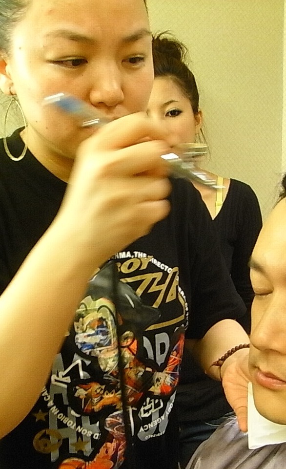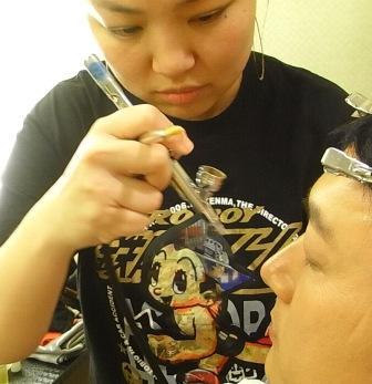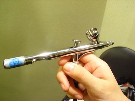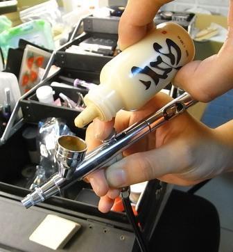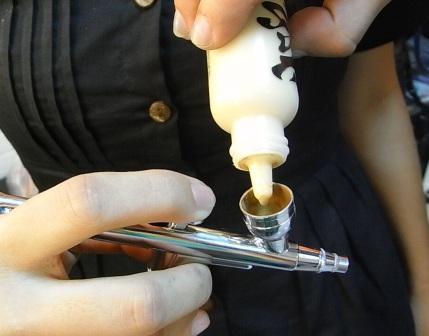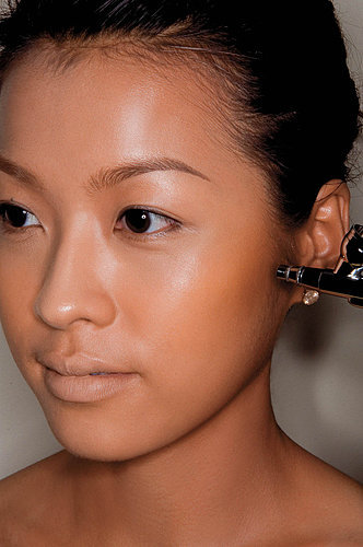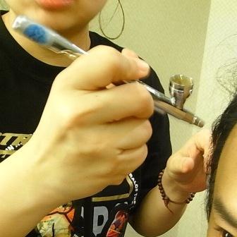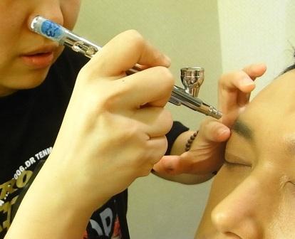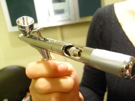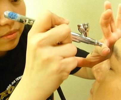 將粉底液裝入噴槍,然後藉由空氣噴霧式均勻噴在皮膚上。例如打粉底,一般都是用手指或者海綿將粉底在臉上推開,現在藉由噴槍的技術,就可以減少手技力道對肌膚的拉扯,所以會對肌膚產生拉提的3D立體效果。而且細微的噴霧顆粒可以填補臉上的細紋、小坑洞,讓皮膚看起來很平滑光順。而且噴霧式的薄透感,可以層層加疊,可以製造出很好的漸層效果,完全打敗是油漆牆壁的傳統濃妝,可以製造出無痕薄透的妝容,哇效果真的是很驚人,我完完全全親眼見證。